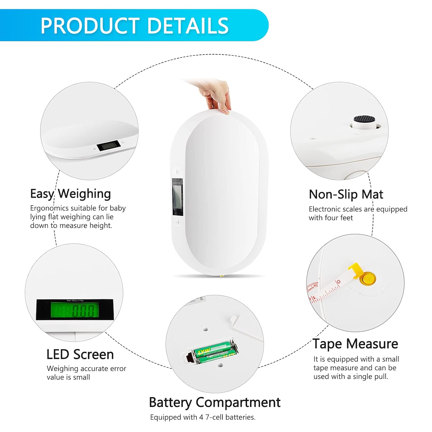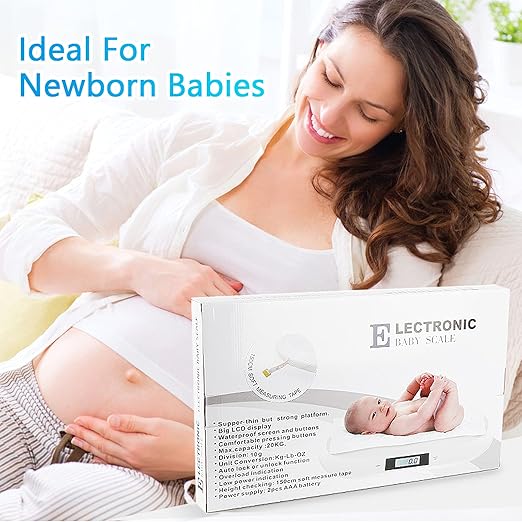 Multi-purpose digital scale for tracking weight of babies, toddlers, pets, and food. Features high-precision sensors, a bright backlit display, and a hold function for active infants. Includes a free tape measure for monitoring growth.