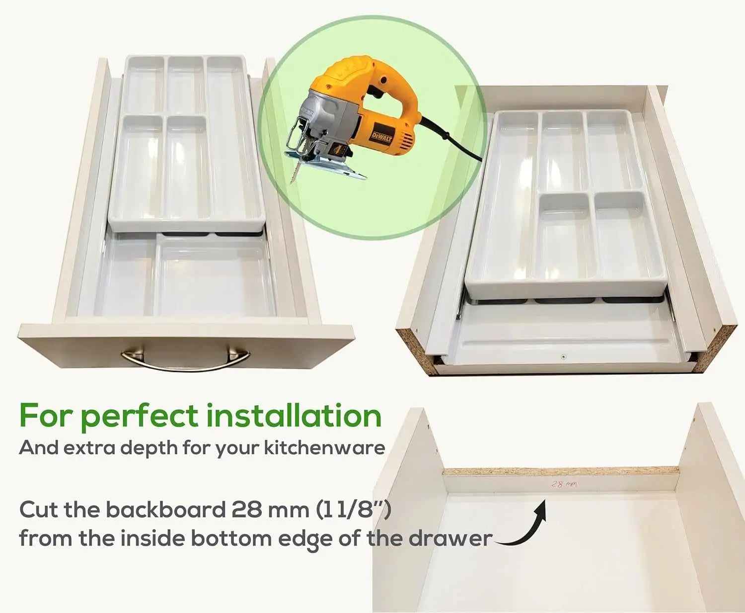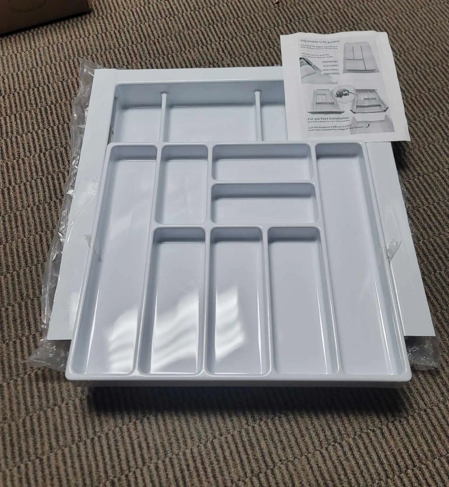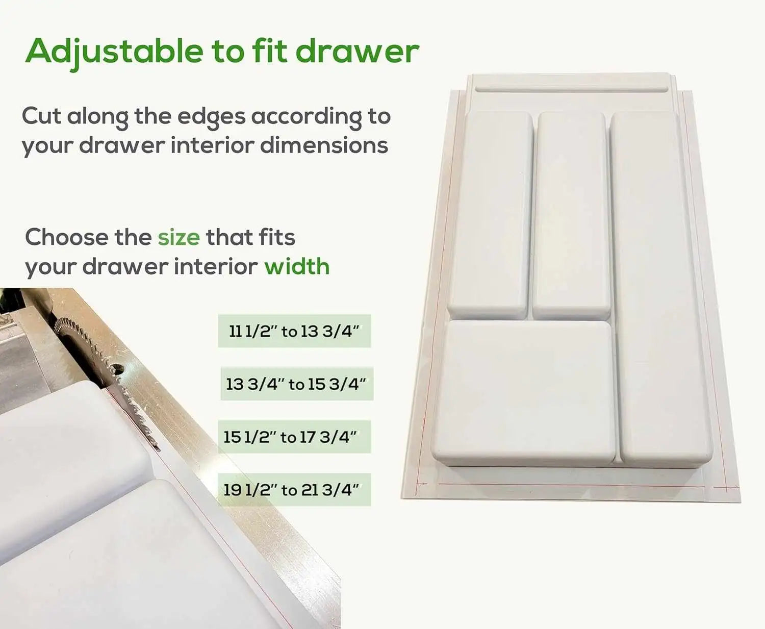 Double-tiered White plastic cutlery tray. Multiple compartments. Adjustable size. Cut to fit your drawer. 19 ½" to 21 ¾"
