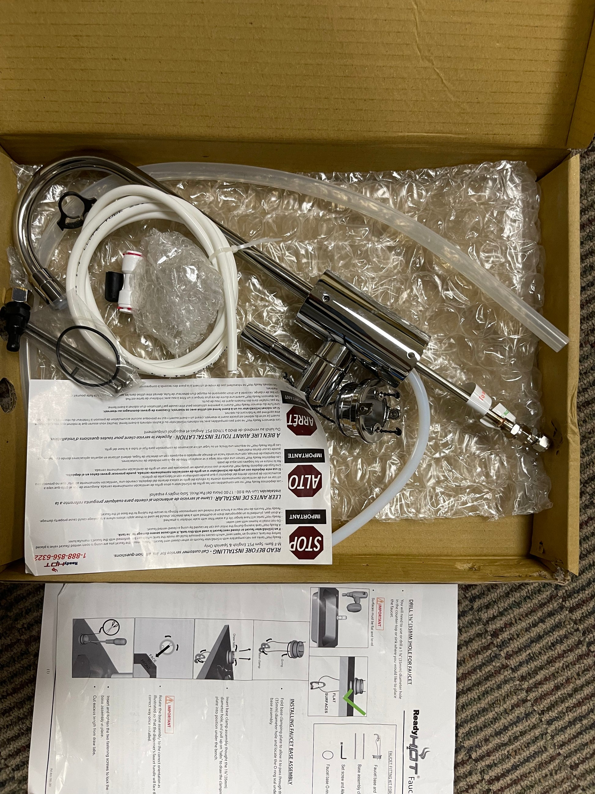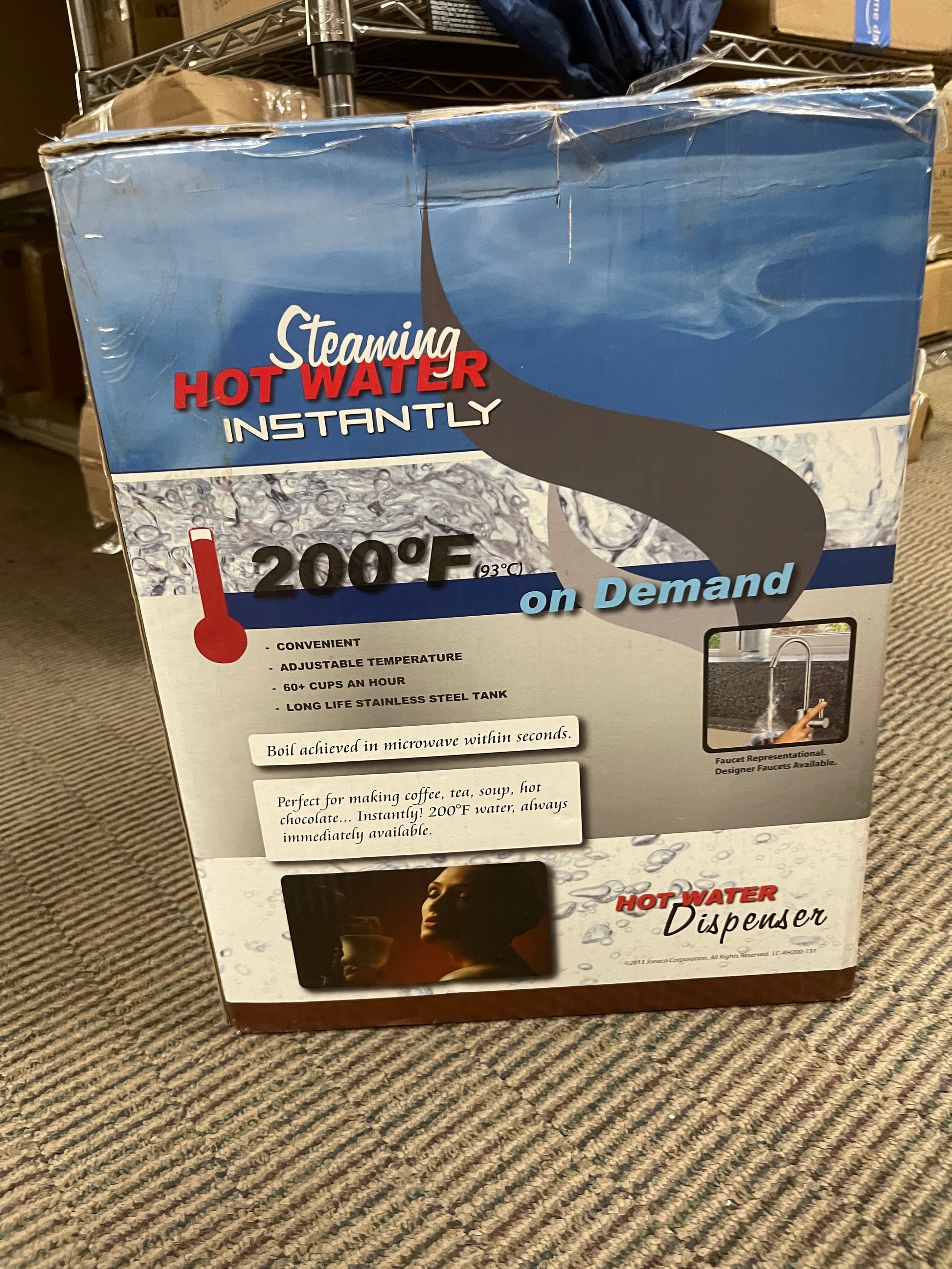 Includes dual lever faucet and stainless steel 2.5-quart tank for under-sink installation. Produces up to 60 cups of near-boiling water per hour. Manual temperature control (140°F–200°F), auto shut-off, and dry-start protection. Ideal for tea, coffee, soup, or quick kitchen tasks.